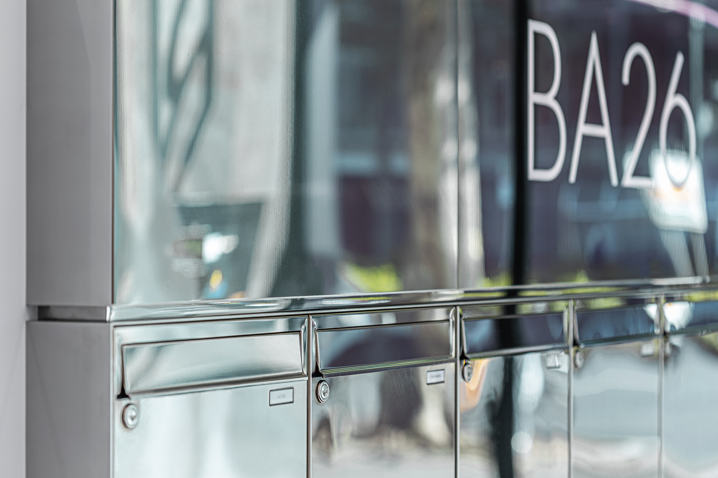 Gesamtlösung nach Architektenplanung: Außentürstation mit Videosprechanlage, integrierter Beschilderung für Gewerbeeinheiten und Codeeingabemodul. Klassische Zeitungsrollen. Briefkastenanlage mit hinterleuchteter Schriftblende und symmetrischer Unterverkleidung.