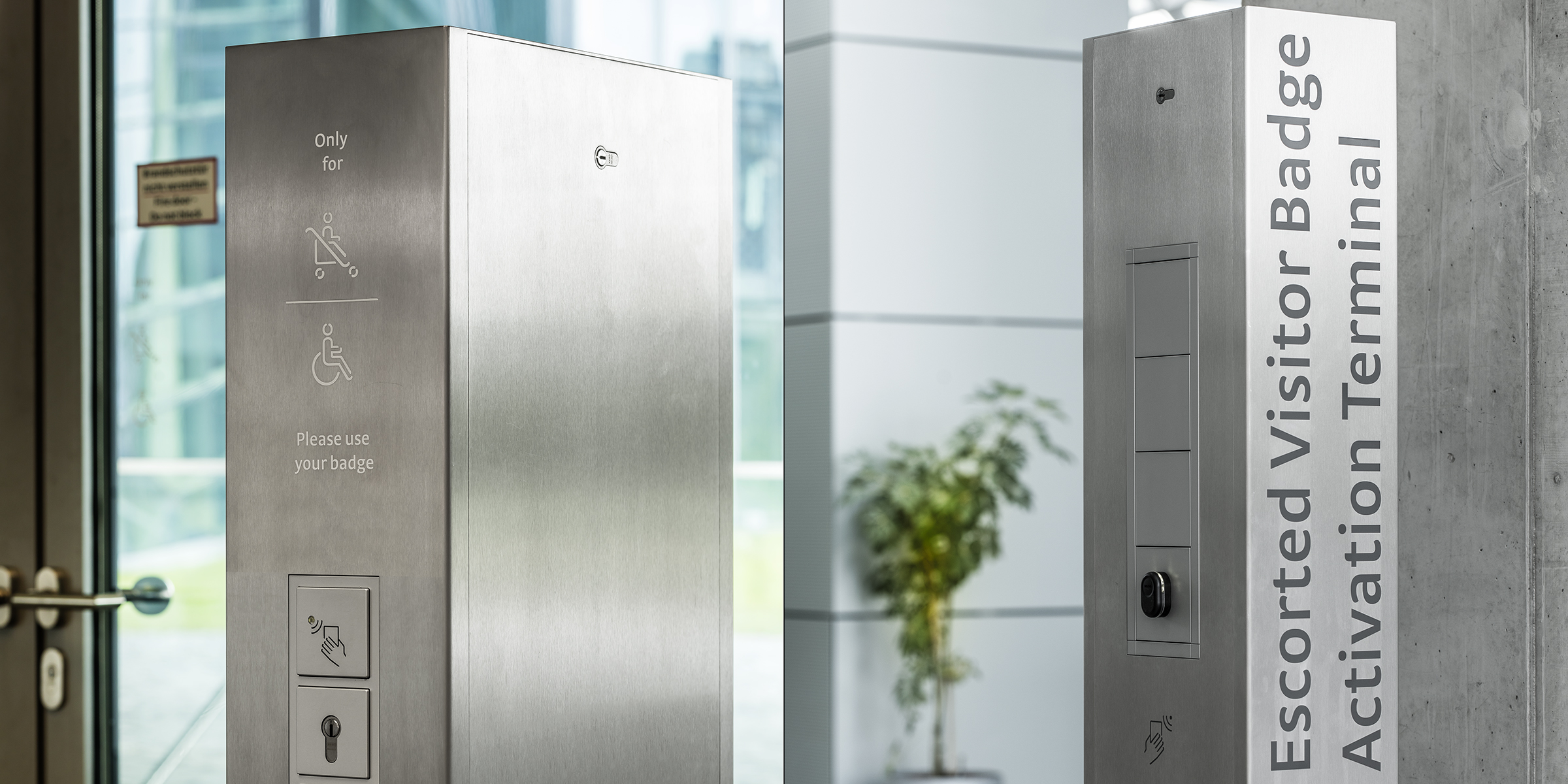 Multifunktionale Bauelemente in Stelenform nach Architektenentwurf für Türsprechanlage, elektronische Zutrittskontrolle und Sicherheitseinrichtungen einschließlich passgenauer Integration verschiedenster Fremdkomponenten. Bedienergerechte Positionierung von Funktionselementen für Pkw und Lkw. Präzisionsbeschriftungen. Arbeiten unter erhöhten Sicherheitsbedingungen.